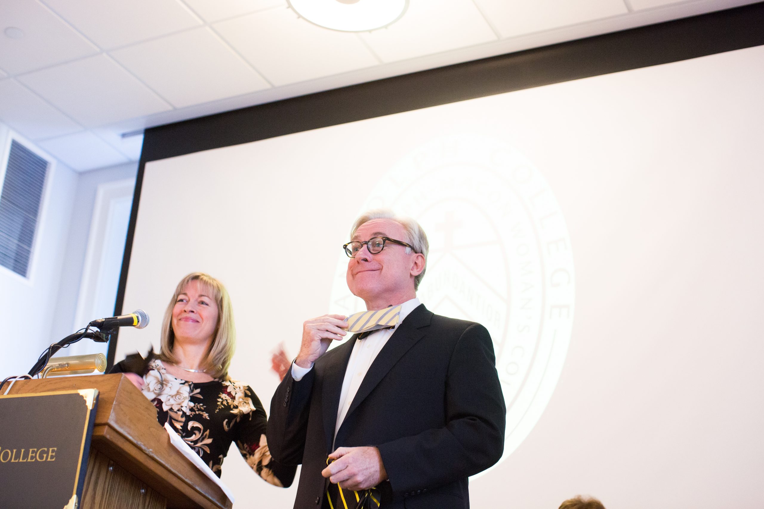 - Alumnae and Alumni Director Heather Garnett presents Bateman with a Randolph bow tie.