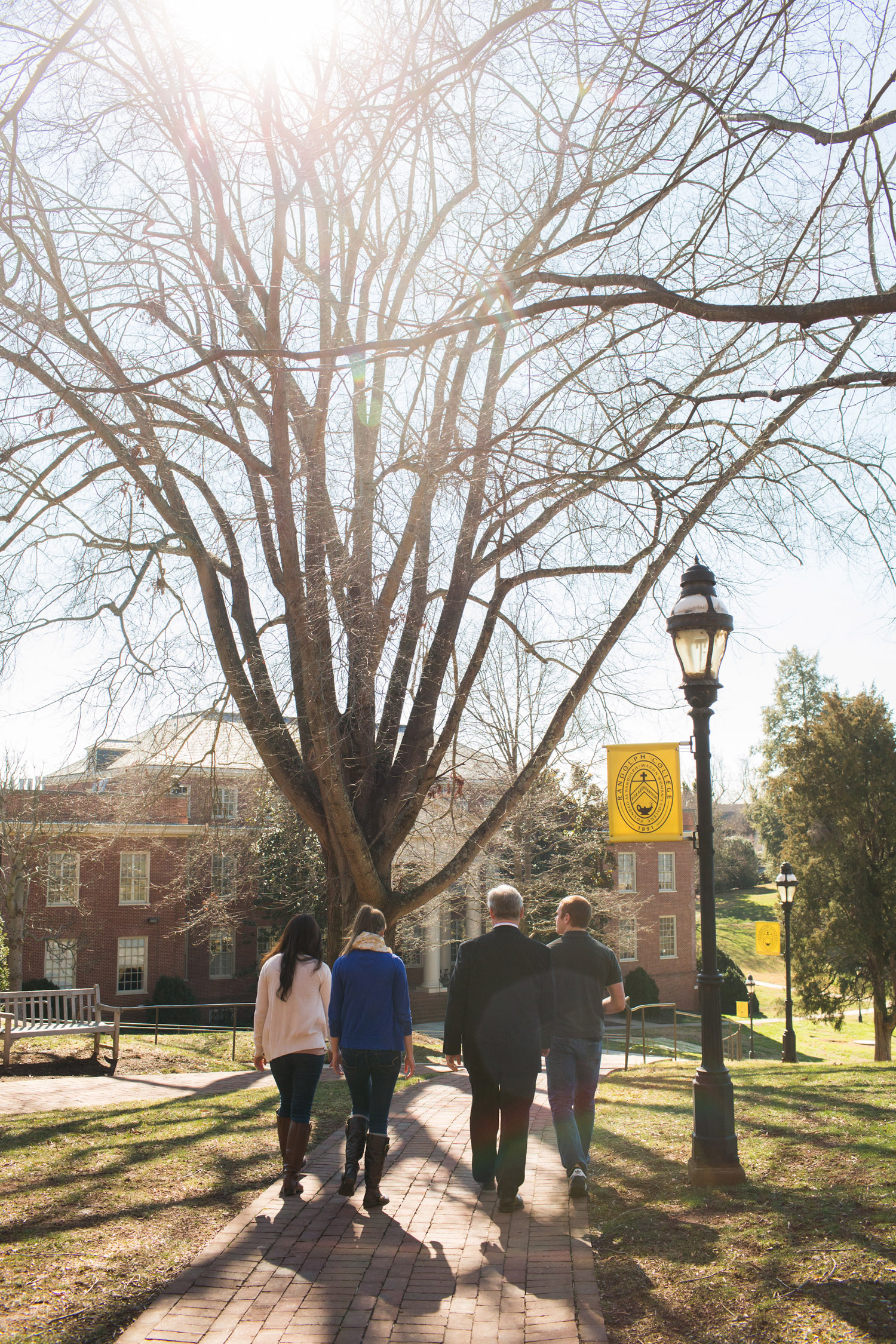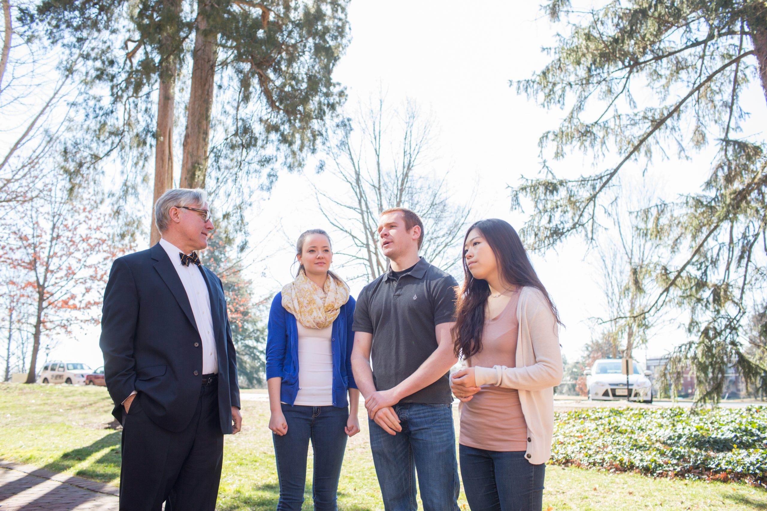 - Dr. Bateman begins a campus tour with (left to right) Gold Key Guides Alyssa DeNisco ’14, Jacob Hood ’14, and Julia Kim ’14.