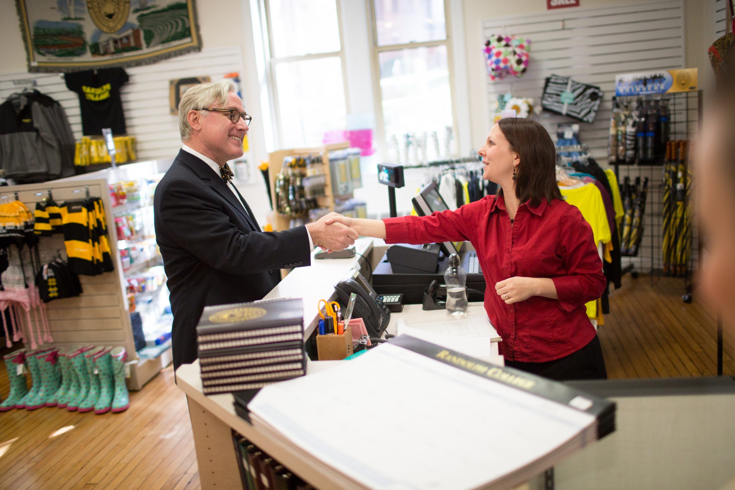 - Dr. Bateman browses the Randolph College Campus Store and meets manager Coral Carter.